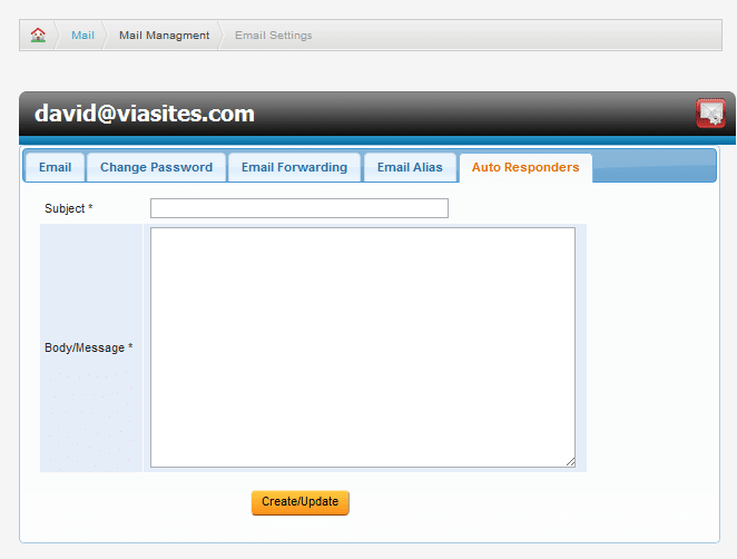 To create an auto-responder, select Auto-Responders from the Email Settings page. Here , enter the subject and body that you would like sent out as an automatic reply to any email you receive. This is perfect for notifying clients of pending vacation or current support issues.