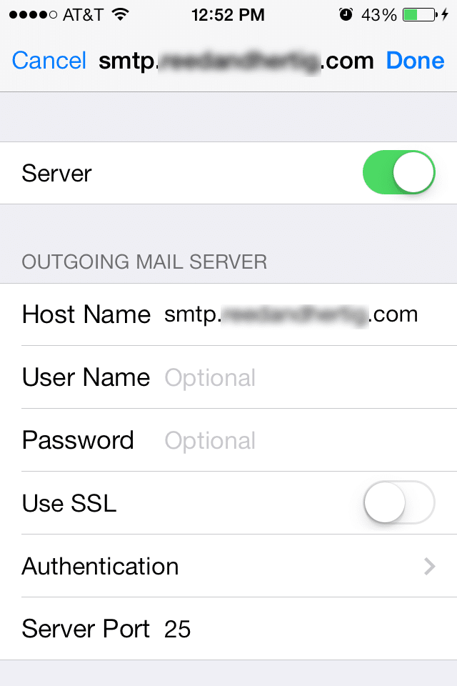 yourdomain.com (NOTE: DO NOT put ‘www’ or ‘smtp’, etc. in front of the domain! The exception is with all Fully Managed Windows Servers, excluding the Business/Reseller III, you will need to use mail.yourdomain.com)**Some Internet Access Providers require you to use their SMTP server.