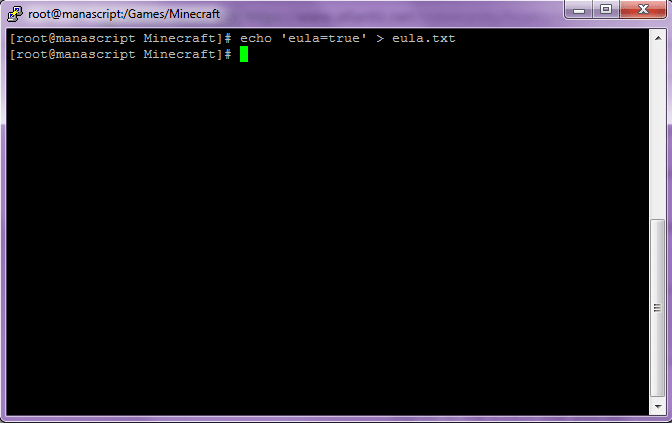 At this point, you might receive a notification asking you to agree to EULA before starting the server. To do that, you’ll need to change “ to “ in the eula.txt file located in the Install folder, which you can do with the following command:echo 'eula-true'>eula.txt