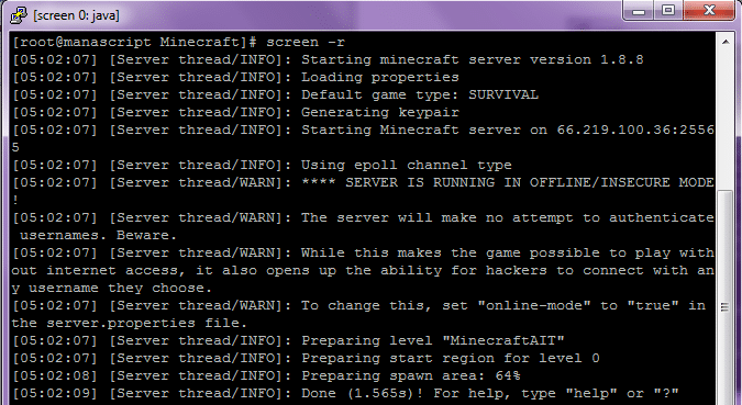 Your Minecraft server is now live and running on a screen, and you should see something like this: