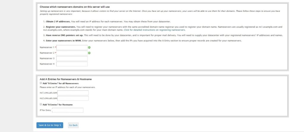 Enter nameservers, for example “ns1.mydomain.com” and ns2.mydomain.com,” then add A Entries for your hostname.