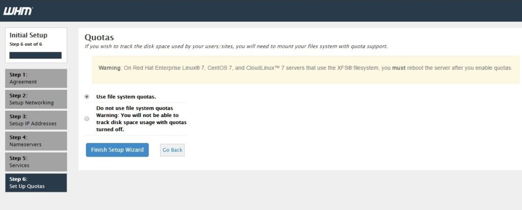 Next, you are asked if you want to use file system quotas. The recommended option is “Use file system quotas.” Click on “Finish Setup Wizard.”