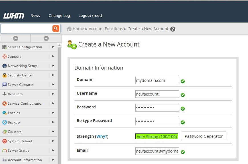 Step 5: Create a New Account and cPanel.
