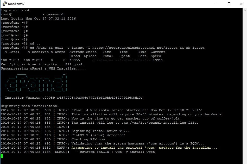 Download and run the following WHM installation script:cd /home && curl -o latest -L https://securedownloads.cpanel.net/latest && sh latest