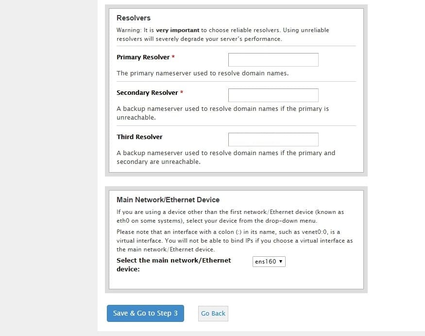 Scroll down, specify DNS resolvers and network device (Ethernet port), then proceed to the next step.