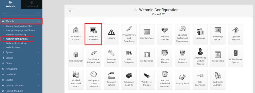 If your VPS has a public IP, it’s better to change the standard port to some. You can do that in the browser interface by navigating to Webmin – Webmin configuration -Ports and Addresses